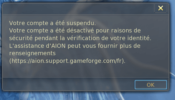 J'essaie de revenir sur Aion après je ne sais combien d'années mais quelle n'est pas ma déception lorsque en essayant de me reconnecté j'apprends que mon compte est bloqué pour raison de sécurité, soit, nouveau pc, nouvelle connexion, reset de mot de passe car celui ci bien sur m'avait échappé.