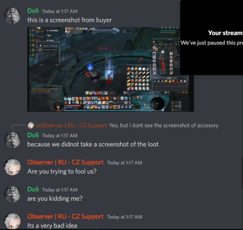 So earlier we were in sauro and Mythic accesory dropped. we tried to sell it for kinah and for some reason buyer couldnot see the mythic Accesory loot but could see the other useless loot from boss. we sent a ticket and there is a proof of Admins doing nothing other than blaming players for their stupidity.