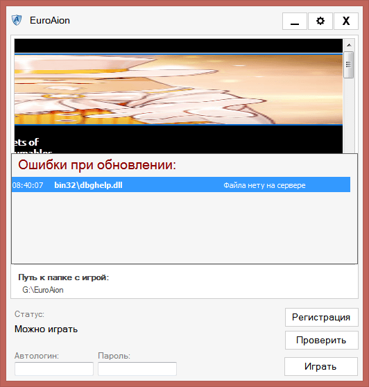 Я внимательно посмотрел Ваш скриншот, такого рода ошибки в 90% случаев вызваны тем, что что-то на Вашем компьютере блокирует доступ к этим файлам. Попробуйте, пожалуйста, скачать файл напрямую и поместить его в соответствующую папку (https://euroaion.com/files/client/bin32/) - перед этим проверьте наличие такого файла в папке с игрой.
