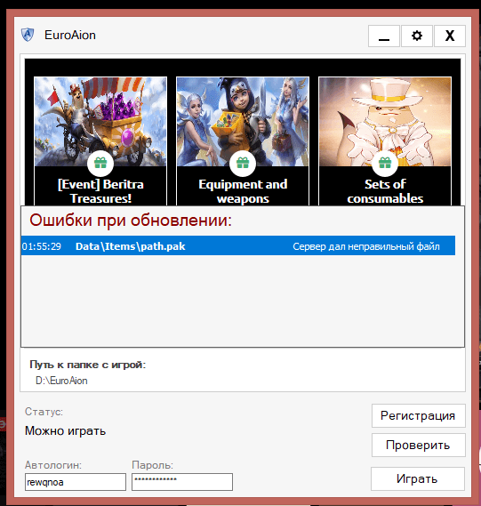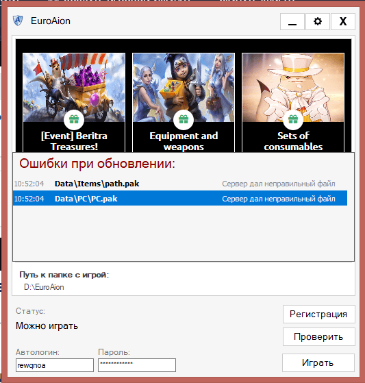 Если это не поможет, то удалите файлы и скачайте их напрямую с сайта https://euroaion.com/files/client/ или же выполните проверку игрового клиента через торрент.