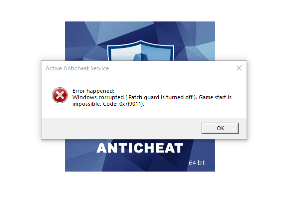 We have contacted the developers of the anticheat and their response is that you have a system with disabled patch guard. You have to make the rollback of the system (if there were any changes made) or reinstall it to the normal one.