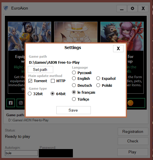When I press the button to launch the game, it runs and launches the NC soft page, after a moment the error Aion(x64)[1024] appears with the message Failed to initialize the game (in English) and Unable to reset the game (in French).
