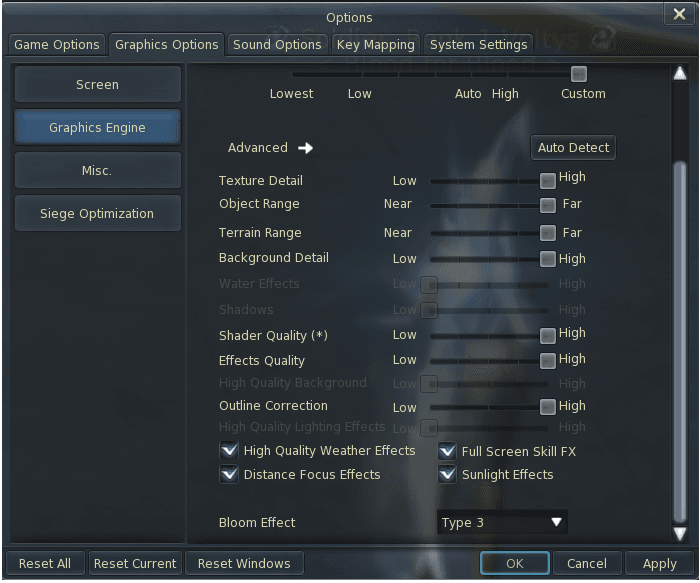 I play EuroAion for some time, and I have problem that was already reported in this year and before. I have monitor 1440p and graphic options like shadows, water and background quality are greyed out, game with no shadows are too bright and its hard to see some textures and objects, I know that this may be 1% of players that have that problem and it'll be no sense in fixing that, but fix is already on GitHub with visible source code, and programist or whoever who adding events and changing game code could just add that fix in next technical break. I know that Topic was already added but was ignored. I please at least for consider that idea.