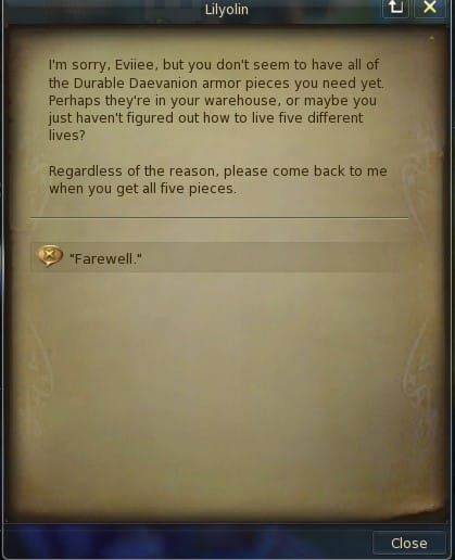 So on level 55 you get the pink quest, where you can get Durable Deavanion Armor. From what I see you can only get the 2 pieces,and then a weapon. But sady, the quest don't work. The NPC says you have to have all pieces of Deavanion Armor to get that weapon. But how? And from where? This completely makes no sense. I would appreciate a bit of help here :D. Thanks!