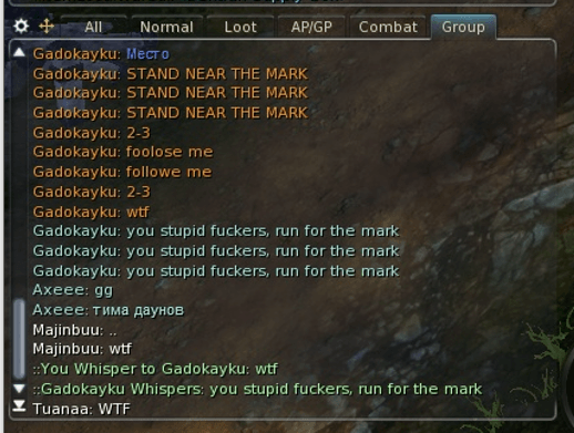 Doing EB, as usual, killing cannons with 3 others, and suddenly the leader, named Gadokayku, starts flaming 'you stupid fuckers, run for the mark'